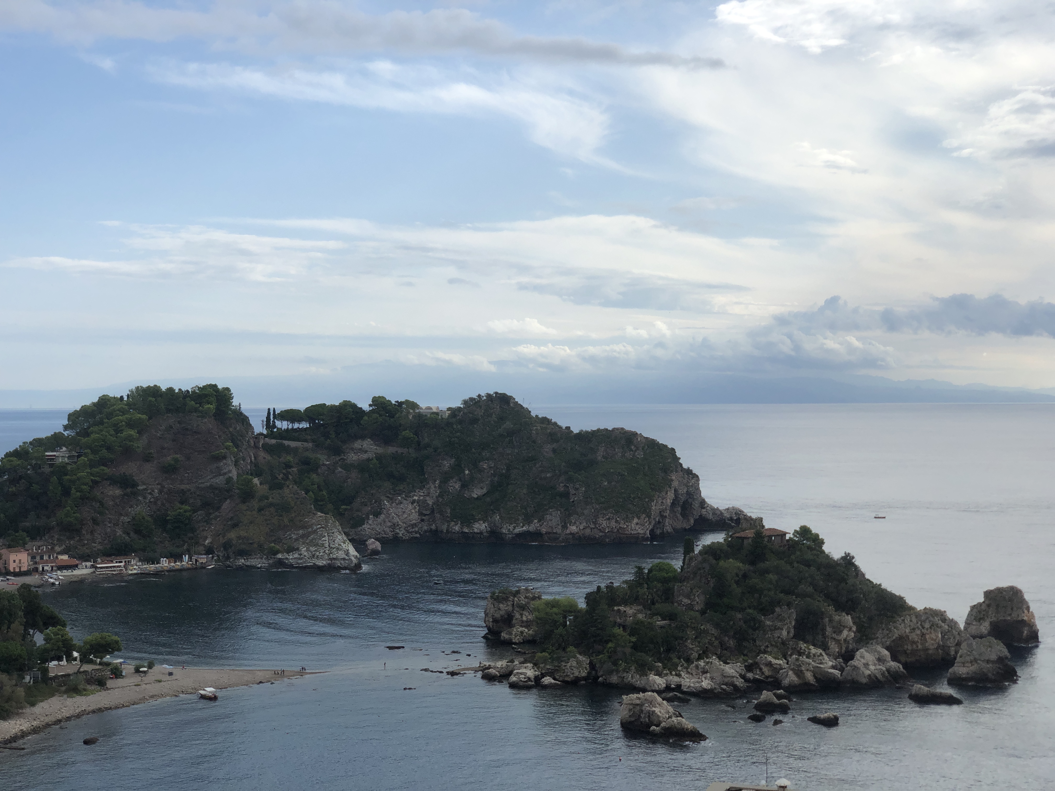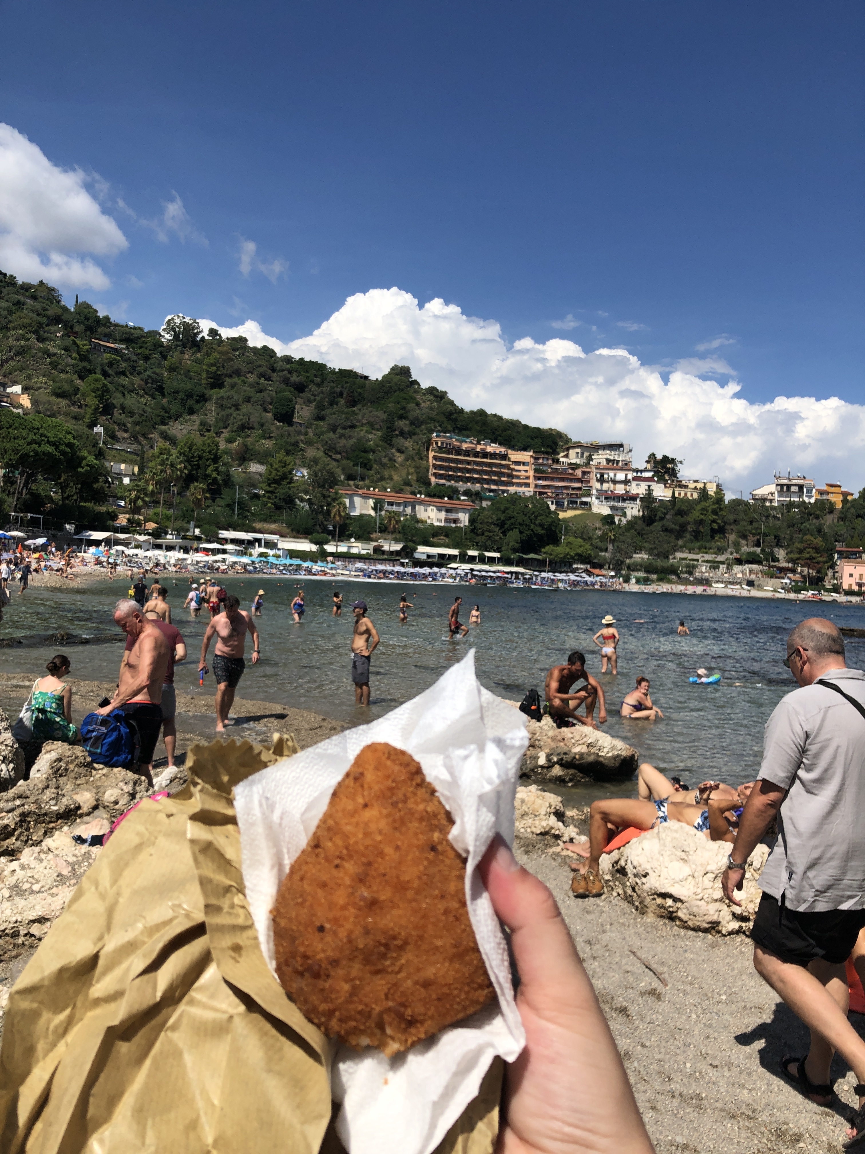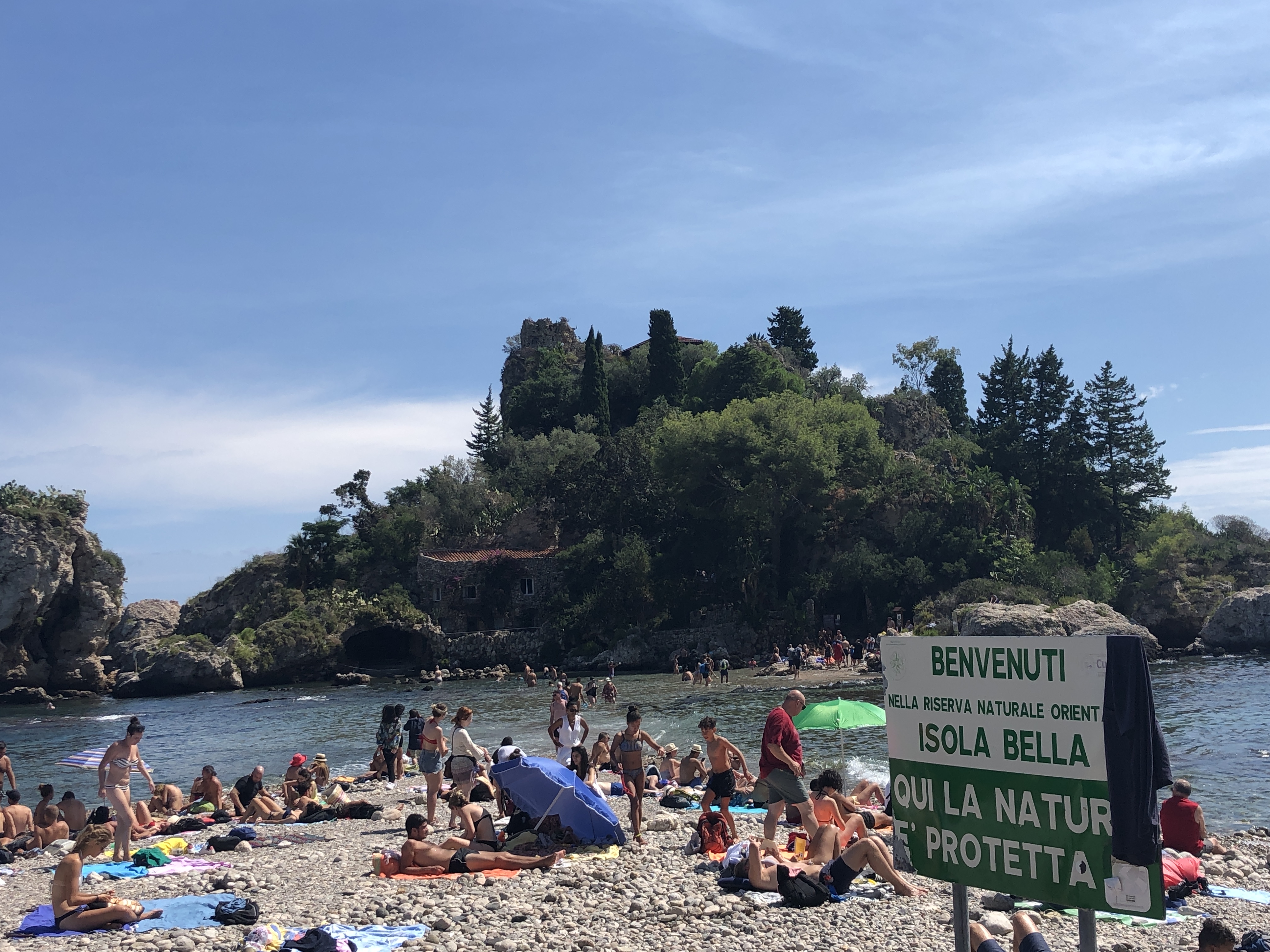Dole je na výber viacero pláži, asi najznámejšia je tu Spiaggia Isola Bella. Priamo pri nej je aj malý ostrov na ktorý ak je nízke more tak sa dostanete po vlastných a ak je vysoké tak preplávate. Na ostrove sa však platí vstupné, je tam akási prírodná botanická záhrada. Samotná pláž je kamienková, veľmi čistá, upravená, so všetkými službami. A ak vás zastihne hlad tak si cestou môžete dať Arancini – ryžovú guličku plnenú napr. syrom, mäsom, paradajkami, atď.