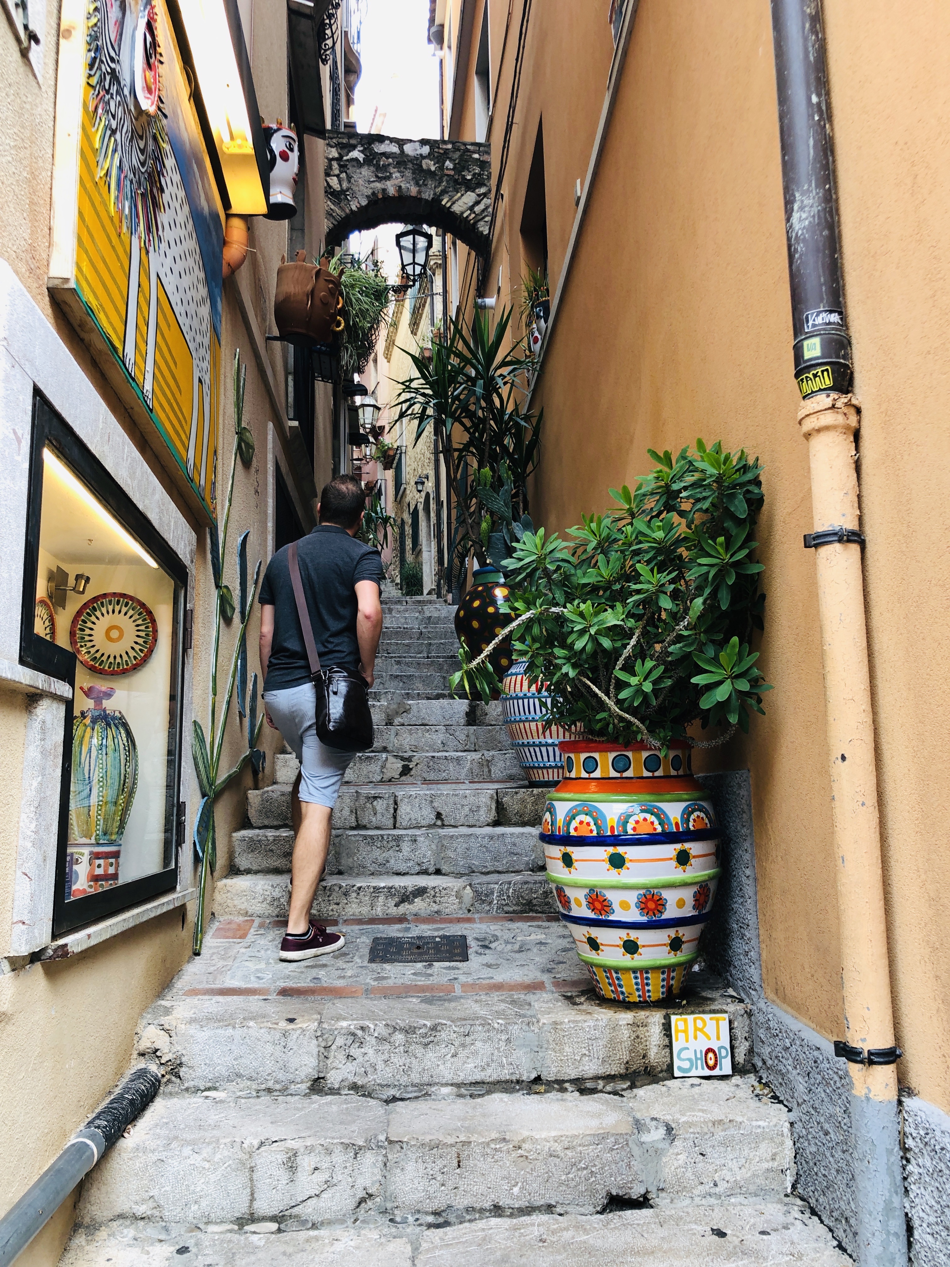 Cestou sa môžete kochať výhľadom na majestátnu a ešte stále funkčnú Etnu. Keď dorazíte do Taorminy zistíte, že vlaková stanica je vlastne úplne inde ako samotne mesto. Totižto veľká časť mesta sa nachádza na kopci, takže nastúpte na autobus priamo pred stanicou a vyvezte sa na konečnú zastávku. Pešo by ste išli určite s vyplazeným jazykom a navyše po ceste vedľa áut. Staré mesto vás privíta kamennou bránou. Následne už pokračujete hlavnou ulicou Corso Umberto I, ktorú lemujú bočné, čím viac tým užšie uličky, často obsypané kvetmi z balkónov, prípadne tovarom z priľahlých obchodov. Každá je niečím zaujímavá a nebudete vedieť ktorú fotiť skôr.