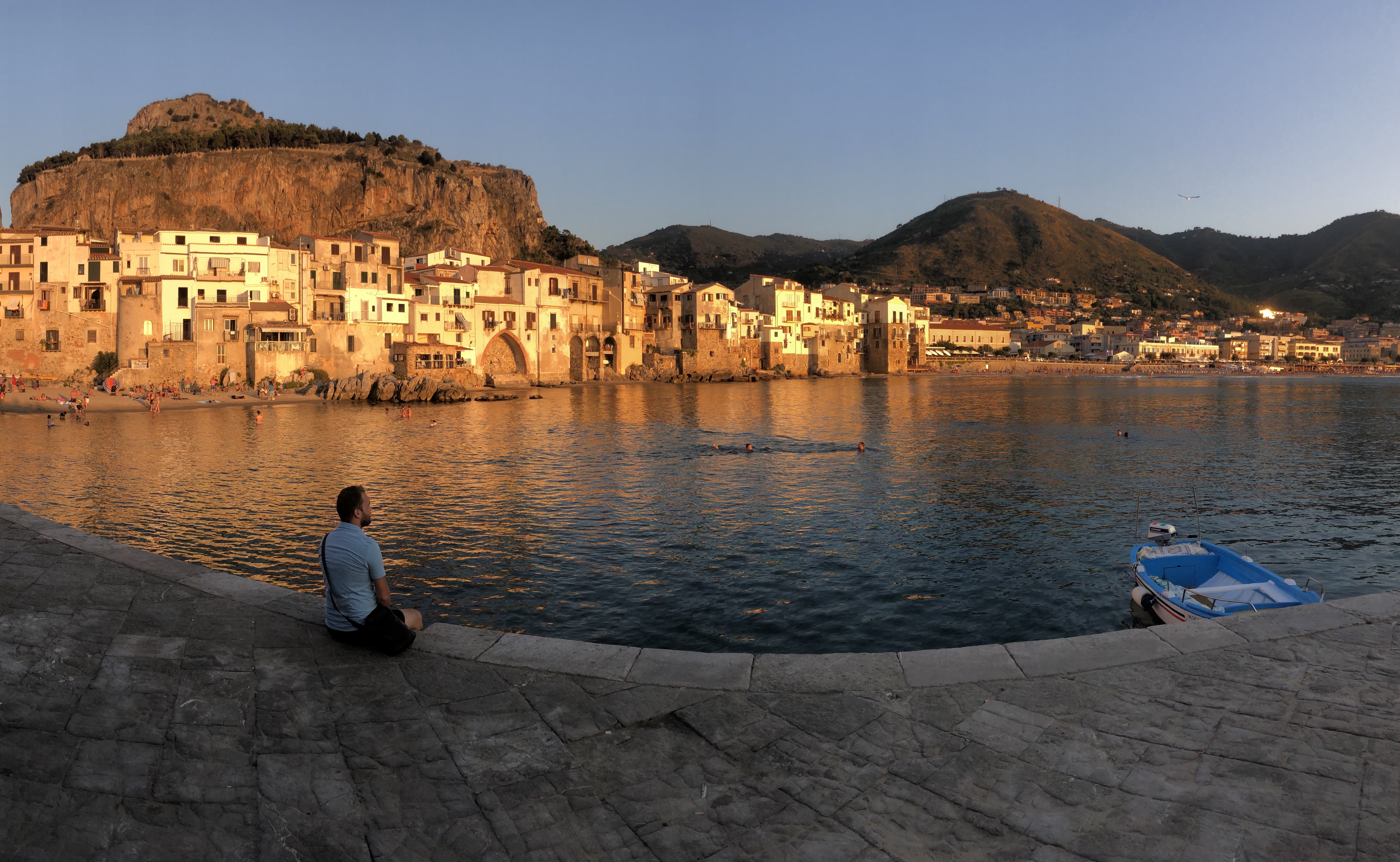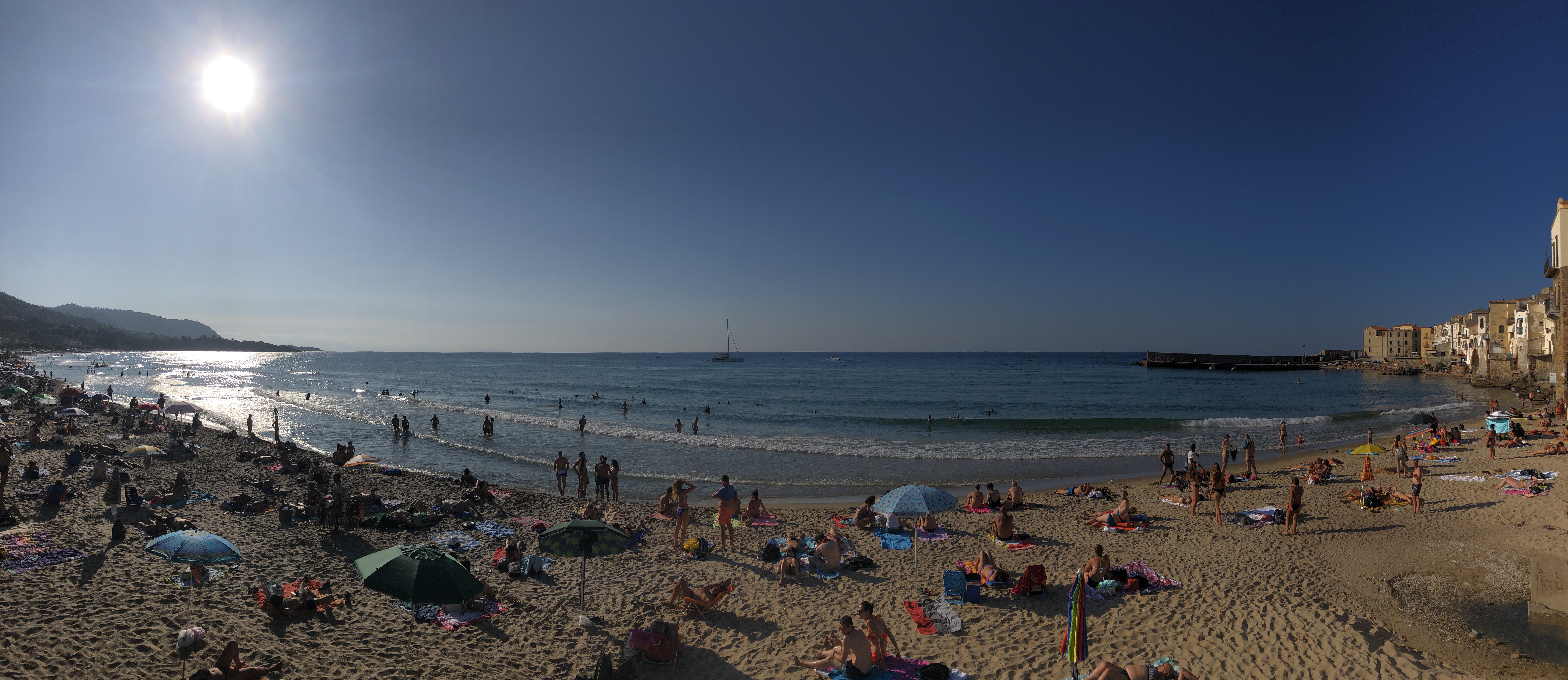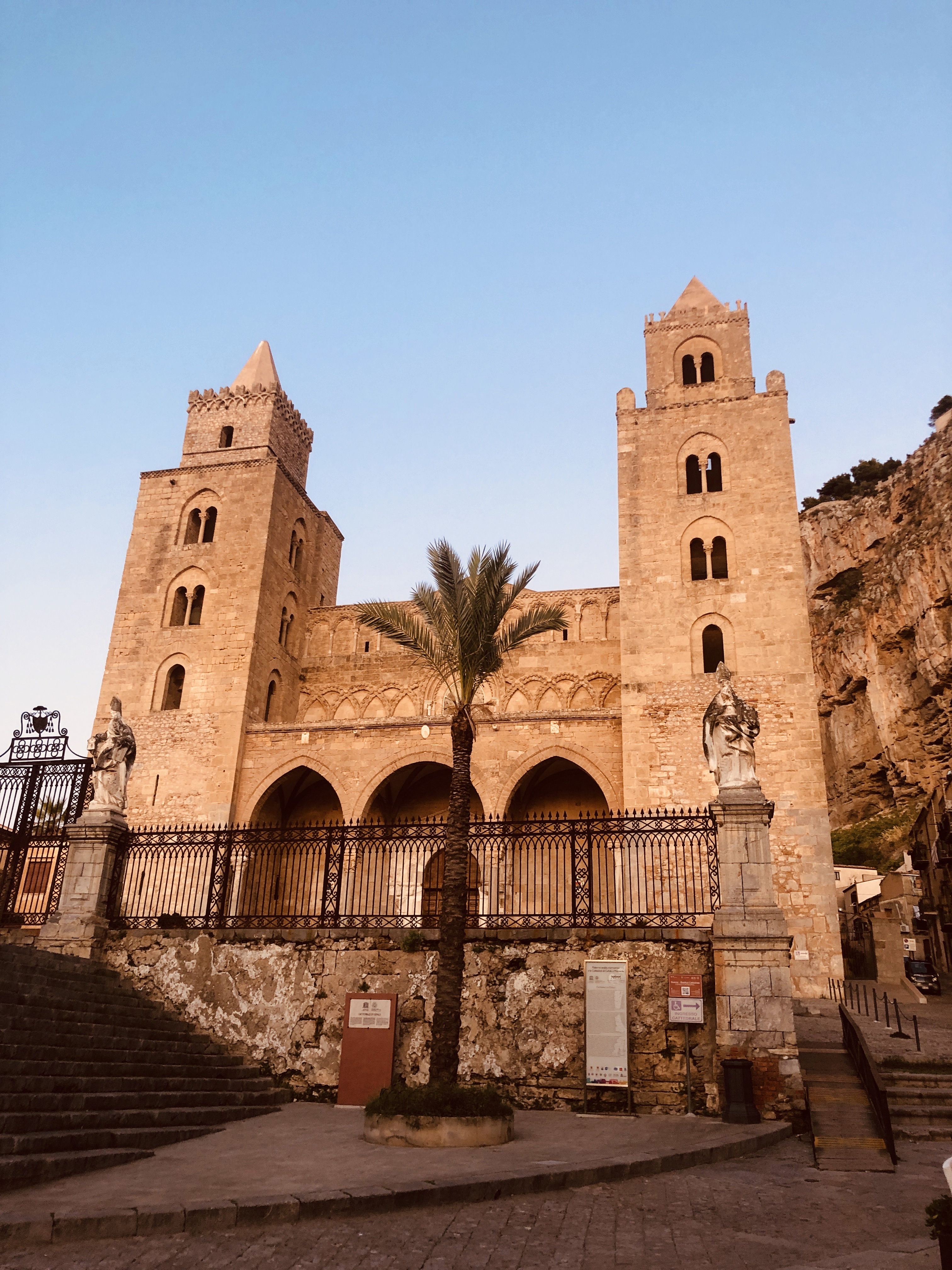Strávili sme tu asi 3 hodiny aj s posedením na kávičke, čo úplne stačilo. Autobusom späť do Palerma, no na stanici rovno prestupujeme na vlak a ideme do ďalšieho mestečka – Cefalu. Ide o jedno z najkrajších miest na Sicílii. Kamenné dlažby a domy postavené pod útesom a z druhej strany šíre more. Dominantou mesta je krásna Katedrála, ktorá vo svetle slnka vyzerá fenomenálne.