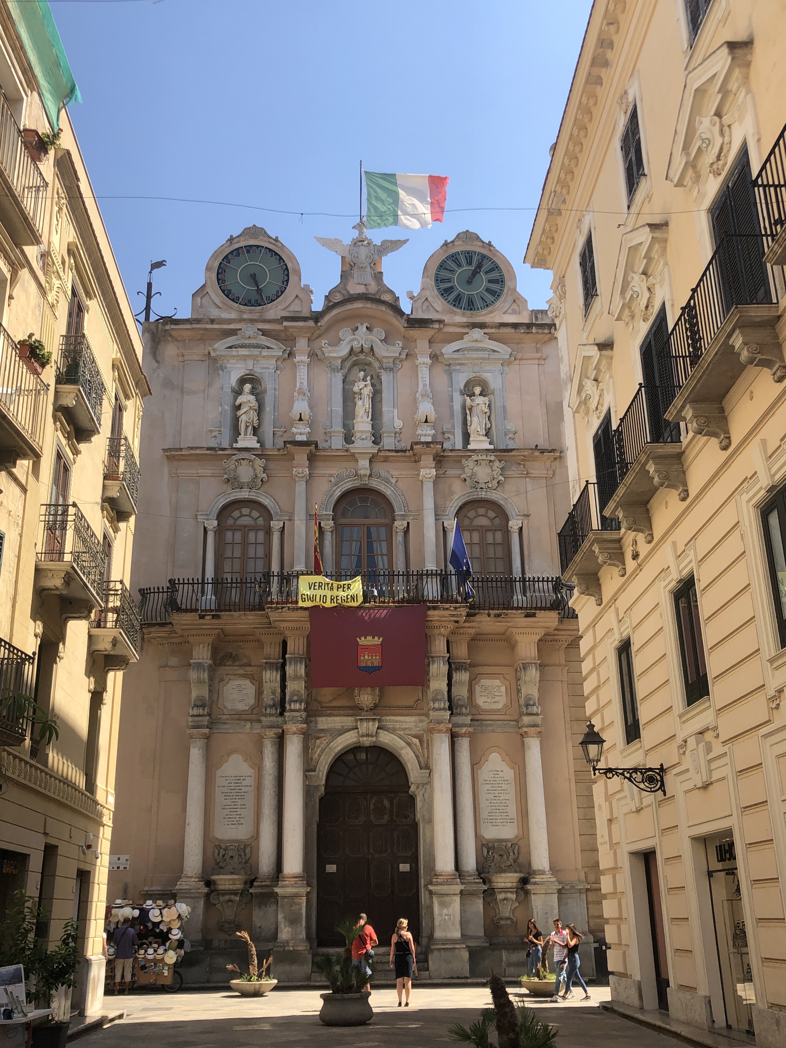 Deň 4 – už sme boli na východe, juhovýchode takže tentoraz a ide na juhozápad do mesta Trapani. Kedysi rybárske mestečko sa dnes teší popularite turistov hlavne kvôli Ryanairu, ktoré ho spája zo zvyškom EÚ. Keďže však nie je také populárne ako ostatné na východe krajiny, zachováva si svoju starú tvár a atmosféru. Začať môžete v prístave kde vás vysadí autobus, následne sa prejsť po Corso Vittorio Emanuele k radnici na ktorej sú hodiny so zverokruhom.