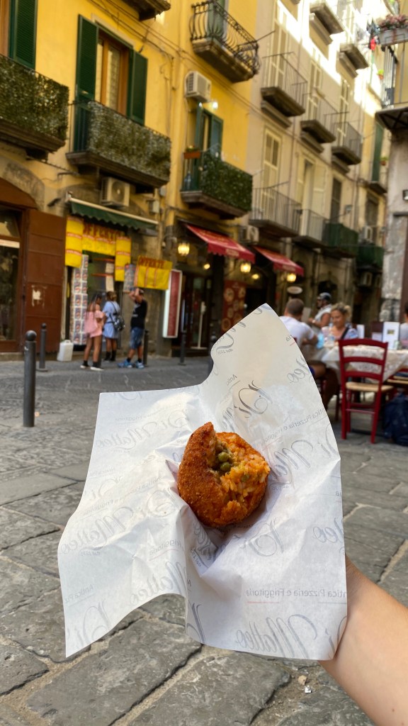 Veď práve tu sa narodila tá pravá pizza, ktorej farby tvorili červená (paradajky), biela (mozzarela) a zelená (bazalka) – ako talianska trikolóra. Všade po meste sú rôzne street food stánky avšak ak chceš ochutnať tú originálnu tak hľadaj označenie Vera pizza Napoletana. Pizza už nikdy nebude ako predtým. Taktiež určite ochutnaj Arancini. Typické jedlo na juhu Talianska. Ide o vyprážanú ryžovú guličku plnenú napr. paradajkami, syrom, mäsom, hubami, rybami, … Okrem toho Neapol ponúka ďalšie klasiky ako výborné cestoviny a keďže leží pri mori tak ryby a morské plody. Ak sa budeš chcieť osviežiť prijemným pitím tak ochutnaj citrónovú variantu obľúbeného Aperolu, tzv. Limone Spritz.
