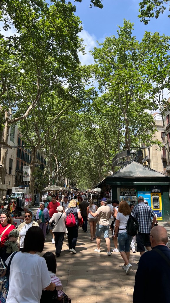 - La Rambla a Tržnica de la Boqueria – najhlavnejšia a asi najpreplnejšia ulica v Barcelone. Dlhá mestská tepna, ktorá končí až pri námestí La Placa de Catalunya. Veľké pozitívum je, že celá ulica je prekrytá stromami takže ti nebude piecť hlavu. Približne v strede ulice je veľká tržnica, ktorá som mal pocit, že bola preplnená ešte viac ako samotná La Rambla. Áno nájdeš tu všelijaké pochúťky, od rýb, mäsa, ovocia, sladkosti .. mňa však odradilo tých milión ľudí. Nie je si ani poriadne kde sadnúť a tak som si svoj fast food musel vychutnať vonku na kraji chodníka.