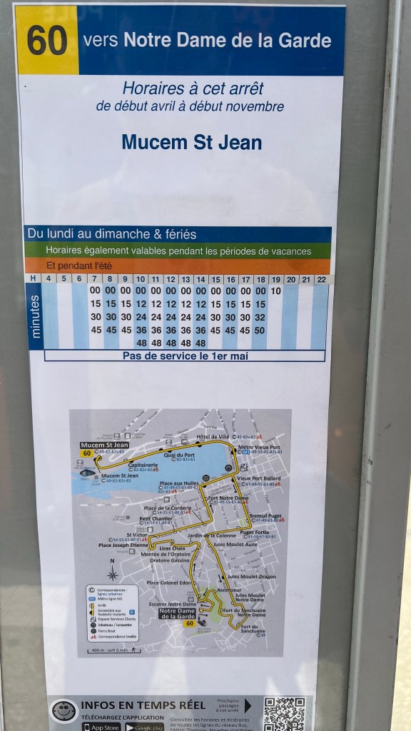 Ak chceš navštíviť hlavnú katedrálu Notre Dame de la Garde, ktorá je na kopci, rozhodne odporúčam vyviesť sa taktiež autobusom, ušetríš čas aj nohy. Nasadni na autobus č.60, ktorý chodí okolo celého centrálneho prístavu. Na zastávke je pekná mapka aj s časmi odchodov. Lístok si môžeš kúpiť u vodiča za 2€ a je platný 1h. nezabudni ho priložiť k čítačke každom mhd prostriedku. Mňa kontrolovali revízori dokonca 2x! (aj v autobuse aj v električke). Ak budeš cestovať viackrát tak nemusíš vyhadzovať lístok, dá sa totiž doplniť v automate, ušetríš tak nejaké centy za kartičku 😉. Tento jeden lístok platí aj na metro, ide len o to aby si stihol jazdu v rámci 1 hodiny, prestupovať môžeš x-krát. Ja som metro využil keď som šiel k štadiónu Orange Velodrome a zároveň električku ktorou som sa dostal do starého mesta Le Panier.
