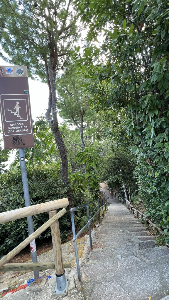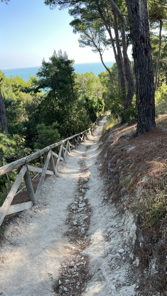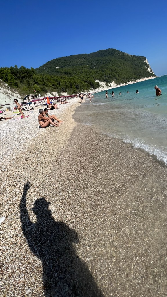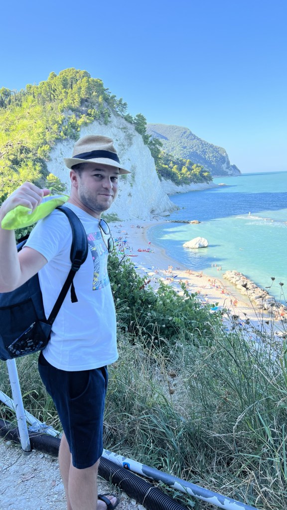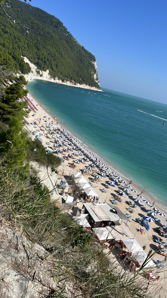 - Spiaggia dei Frati – táto pláž sa nachádza v meste Sirolo v časti Numana. V tomto mestečku je viacero pláži ktoré majú status „modrej vlajky“. Konkrétne táto je typická prírodná útesová pláž. Odporúčam auto nechať na niektorom zo záchytných parkovísk (3€ na deň) a ďalej sa ide už pešo. Je to však iba takých 15 minút, cesta vedie cez mierny les a je dobre upravená. Po niekoľkých schodoch ste už dole na pláži. Taktiež sú tu súkromníci s lehátkami (24€ na deň za 2 lehátka a slnečník), ale aj časť vyhradená pre deky. Samotná pláž je mix piesku a kamienkov a voda je nádherne zafarbená z modrej až zelenej farby. Keďže pláž má modrú vlajku sú tu tým pádom zabezpečené aj sprchy, kabínky, wc, bary, separovaný odpad.