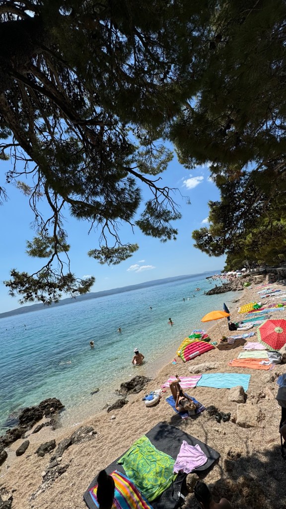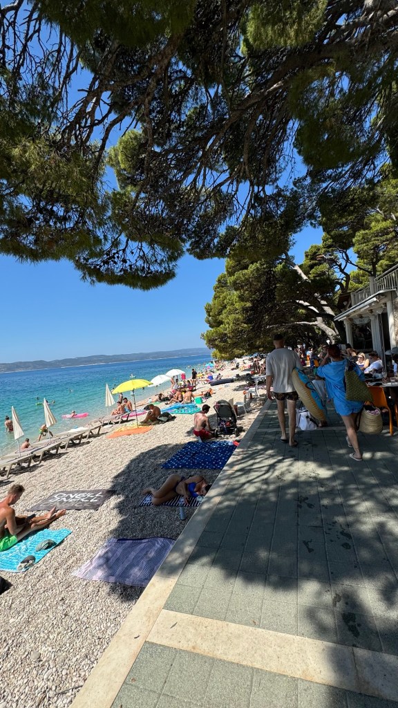 Punta Rata (Brela) – za mňa absolútny highlight! Táto pláž je považovaná za jednu z najkrajších v Chorvátsku a celkovo aj v Európe. Ak pôjdete autom tak na výber máte buď prvé záchytné parkovisko na pravej strane pred búdkou s rampou. Parkovisko je na slnku a stojí 25€ na celý deň (nedá sa platiť iba na pár hodín). Odporúčam však prejsť búdkou s rampou, zídete ešte bližšie k pláži a tu máte na výber. Buď odstavíte auto na parkovisku na celý deň za 20€, alebo ho zaparkujete na druhom parkovisku kde sa platí za každú hodinu 4€. Pozor opäť iba v hotovosti. Tu už sú všade borovice takže budete mať auto v chládku celý deň, na rozdiel od horného parkoviska. Ak sa vám nechce ísť autom tak rátajte že pešo je to z hora až k pláži dobrých 15-20 minút a naspäť hore 2x toľko.